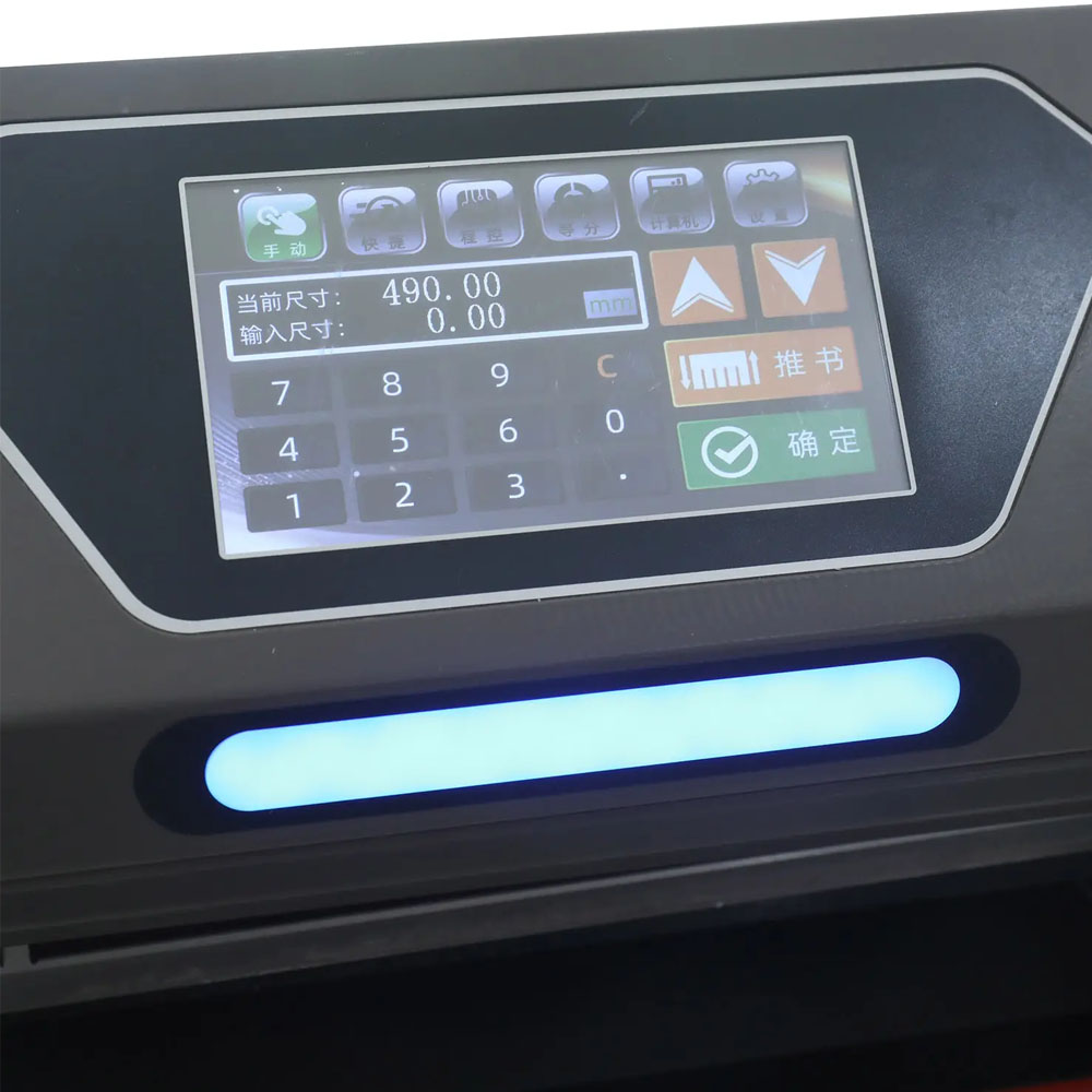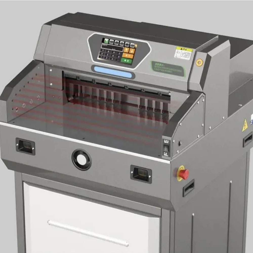 Guillotina eléctrica programable para altura de corte de 80 mm, excelente calidad de corte, ideal para refinado de libros, corte de pilas de cualquier clase de papel, luz infrarroja para una operación segura y motor de bajo ruido.